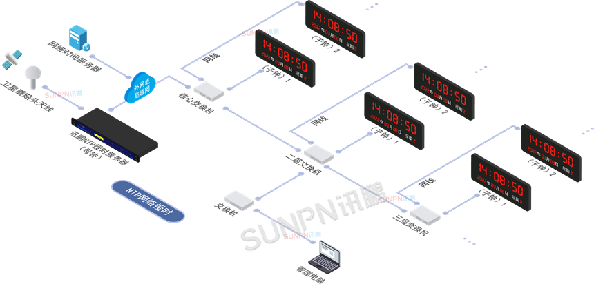 讯鹏科技NTP同步时钟的核心在于其独特的授时架构。同步时钟系统通过卫星天线接收北斗/GPS卫星时间源,获取权威且稳定的全球标准时间。时间信号随后经由楼层交换机传输至各区域的网络同步时钟设备,形成覆盖全院的NTP网络授时闭环。这一设计不仅实现了时间信号的高效分发,还通过母钟与子钟的层级结构,确保医院内所有设备、系统和终端的时间一致性。