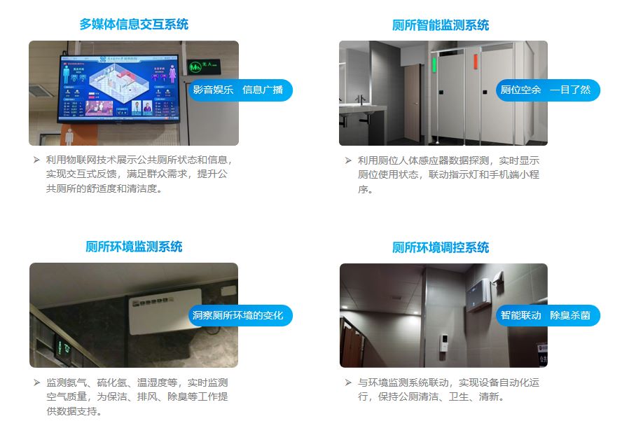 公厕是城市公共服务的基础设施,公厕的整体面貌将直接影响城市的舒适度。传统的公厕普遍存在数量少、环境差、治理难等痛点,管理弱这方面一直是大众反映最强烈的问题,严重阻碍了城市市政和物业楼宇的管理,具体表现为卫生环境差,管理维护不到位,厕所数量规模不足,监管不到位等。智慧公厕运用互联网、物联网、云计算等创新手段来优化公共厕所管理和服务,包括厕所使用引导、环境监测、厕所设备管理、厕所能耗管理、厕所云端综合管理等技术手段。为公厕的环境卫生提供了科学、合理的管理手段,使公厕管理业务更加高效、智能和有序。