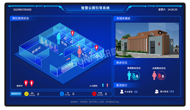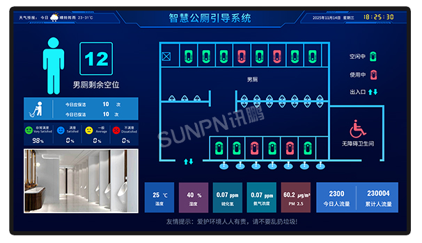 讯鹏办公楼宇智慧公厕系统搭载智慧公厕引导大屏 ,集成多维度信息: