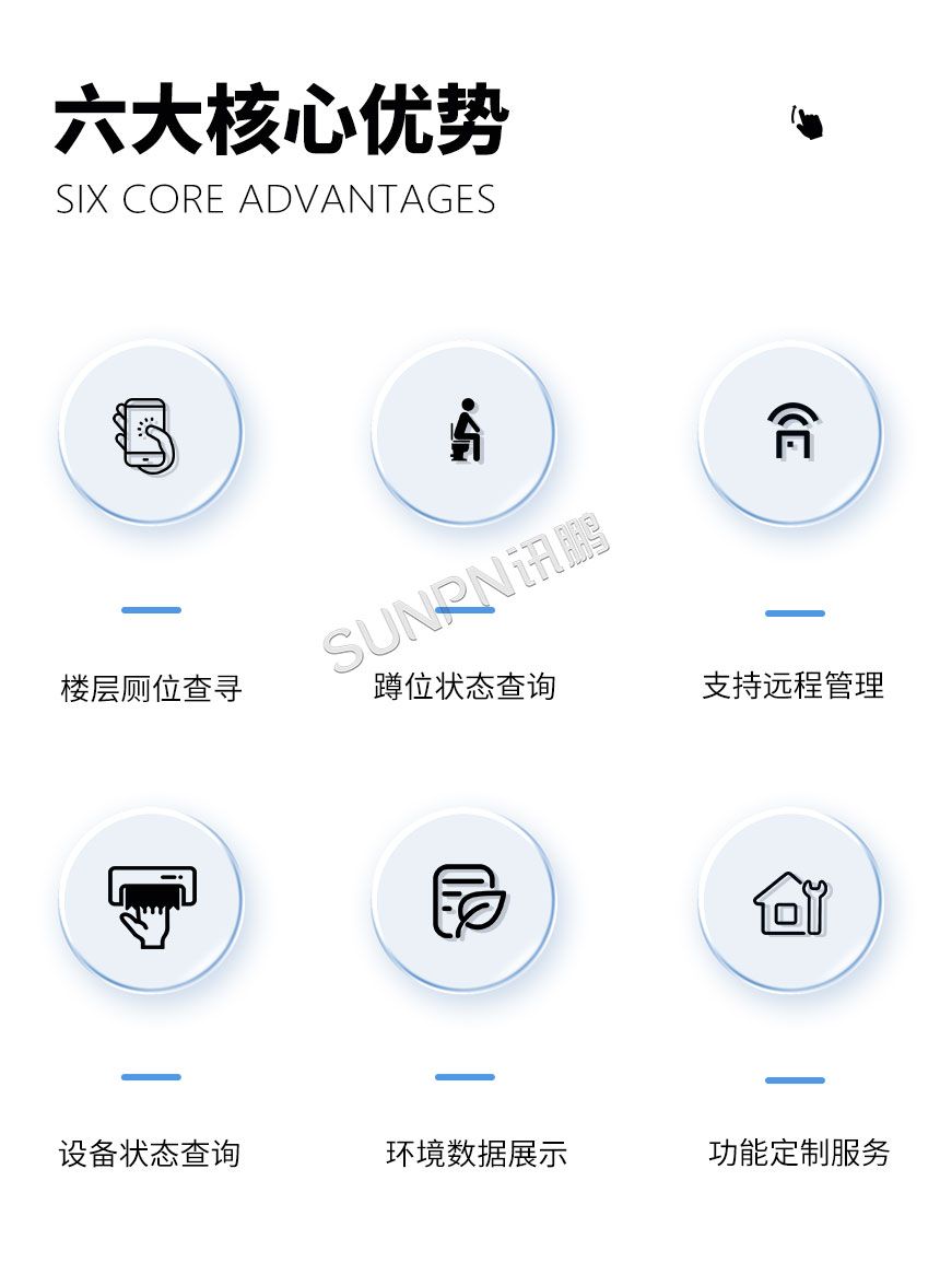 讯鹏楼宇智慧公厕引导系统的核心硬件包括激光传感器、无线网关和供电箱。激光传感器负责厕位状态的检测,通过LORA无线传输技术将蹲位数据上传至云平台。无线网关作为网关通信设备,接收传感器数据并与云平台进行数据交互。供电箱则是集中弱电电箱,为系统的正常运行提供稳定的电力支持。
