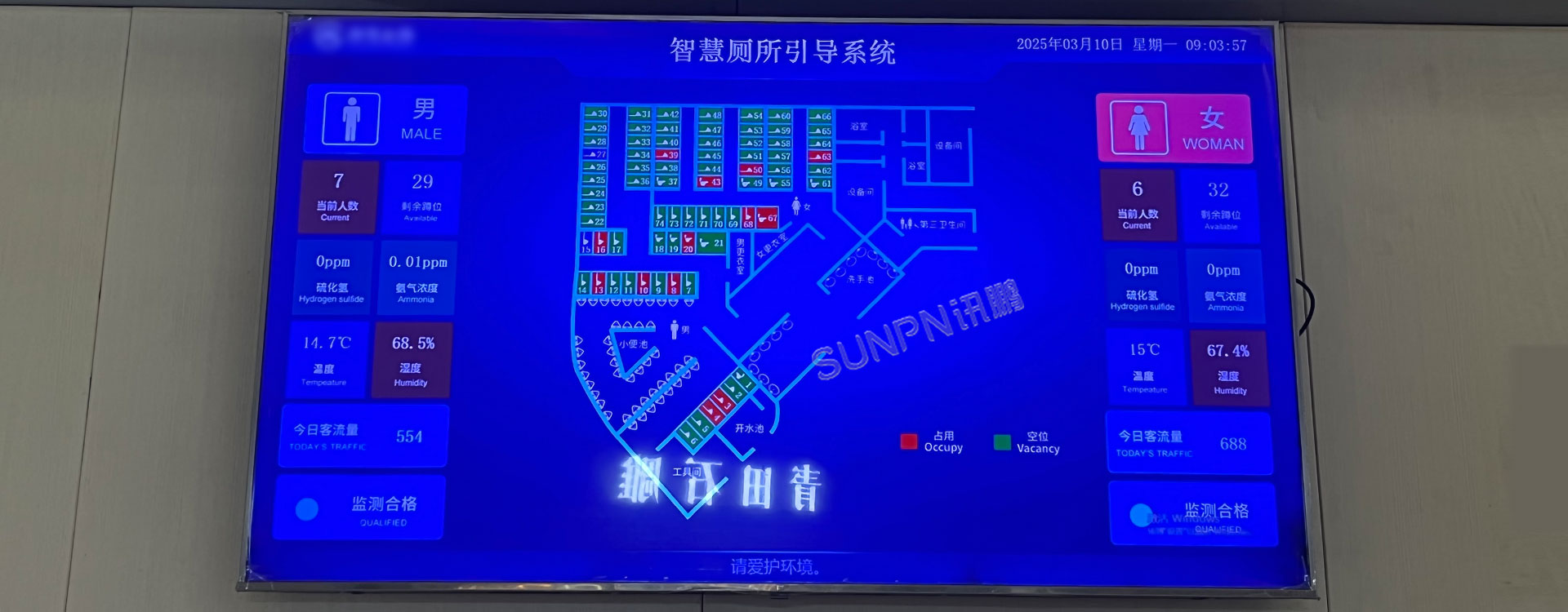 智慧公厕系统引导大屏,设置于公厕入口处,实时显示各厕位状态、当前使用人数及公厕环境数据,为旅客提供精准引导;