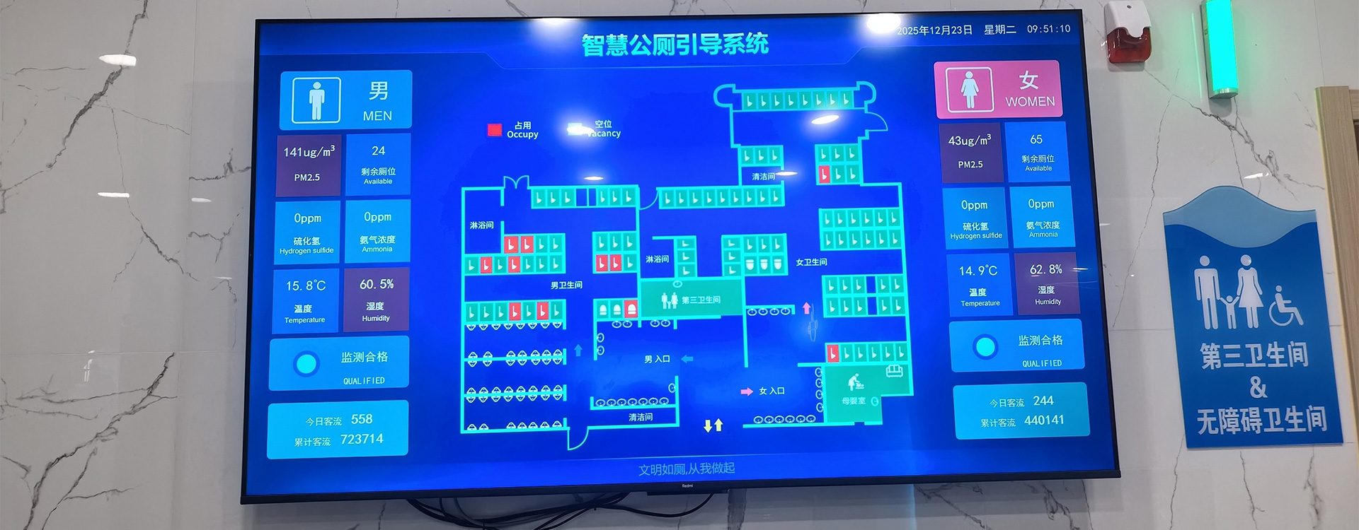 智慧公厕系统通过客流统计功能,实时监控公共厕所入口和出口流量,为公共厕所运营管理和清洁调度提供数据支持。 例如,当男厕达到30次访问时,系统会触发清洁派遣提醒,确保清洁工作及时、高效。
