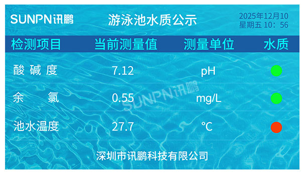 讯鹏液晶水质检测公式牌的数据采集摒弃传统繁琐的人工取样分析,配置水质分析传感器检测游泳池水质。实现水质数据的实时、自动、精准呈现。以某泳池公示牌为例,酸碱度7.12pH、余氯0.55mg/L、池水温度27.7℃等数据清晰展示,绿色/红色标识直观反馈水质是否达标,让管理者与泳客对水质状况一目了然,彻底解决监测滞后问题。